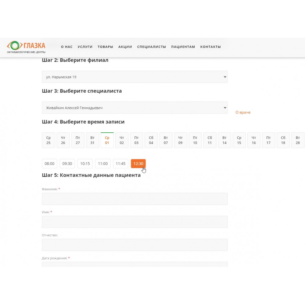 Актуальные данные по врачам и доступном времени для записи пациентов приходят на сайт через синхронизацию с 1С:Медицина.